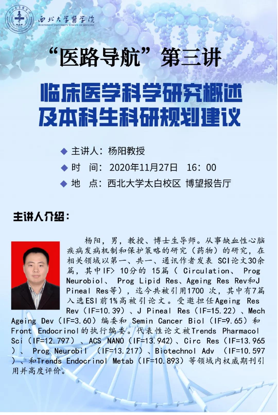 2020年11月27日,学院邀请学部教授、博士生导师、2020级生物医学科学班班主任杨阳为YABO鸭脖官网全体学生做“临床医学科学研究概述及本科生科研规划建议”学术报告。本次讲座旨在指导医学生深入了解科学研究的目的和方法、进一步理解临床研究的重要性,指导学生树立严谨的科研态度,引导学生尽早尽快找准方向,走上科研探索之路。