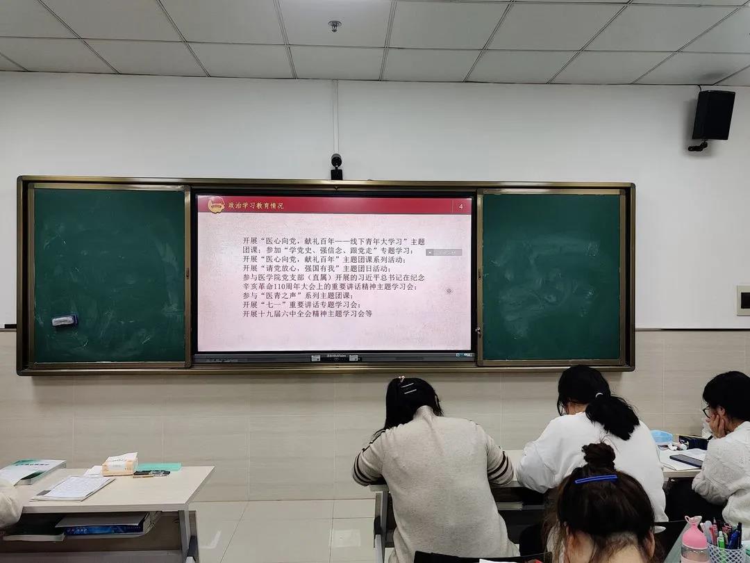 2019级临床医学团支部书记汇报团支部党史学习教育开展情况和组织生活会准备情况,全体团员依照“有信仰、讲政治、重品行、争先锋、守纪律”五个方面,开展团员先进性评价民主测评。