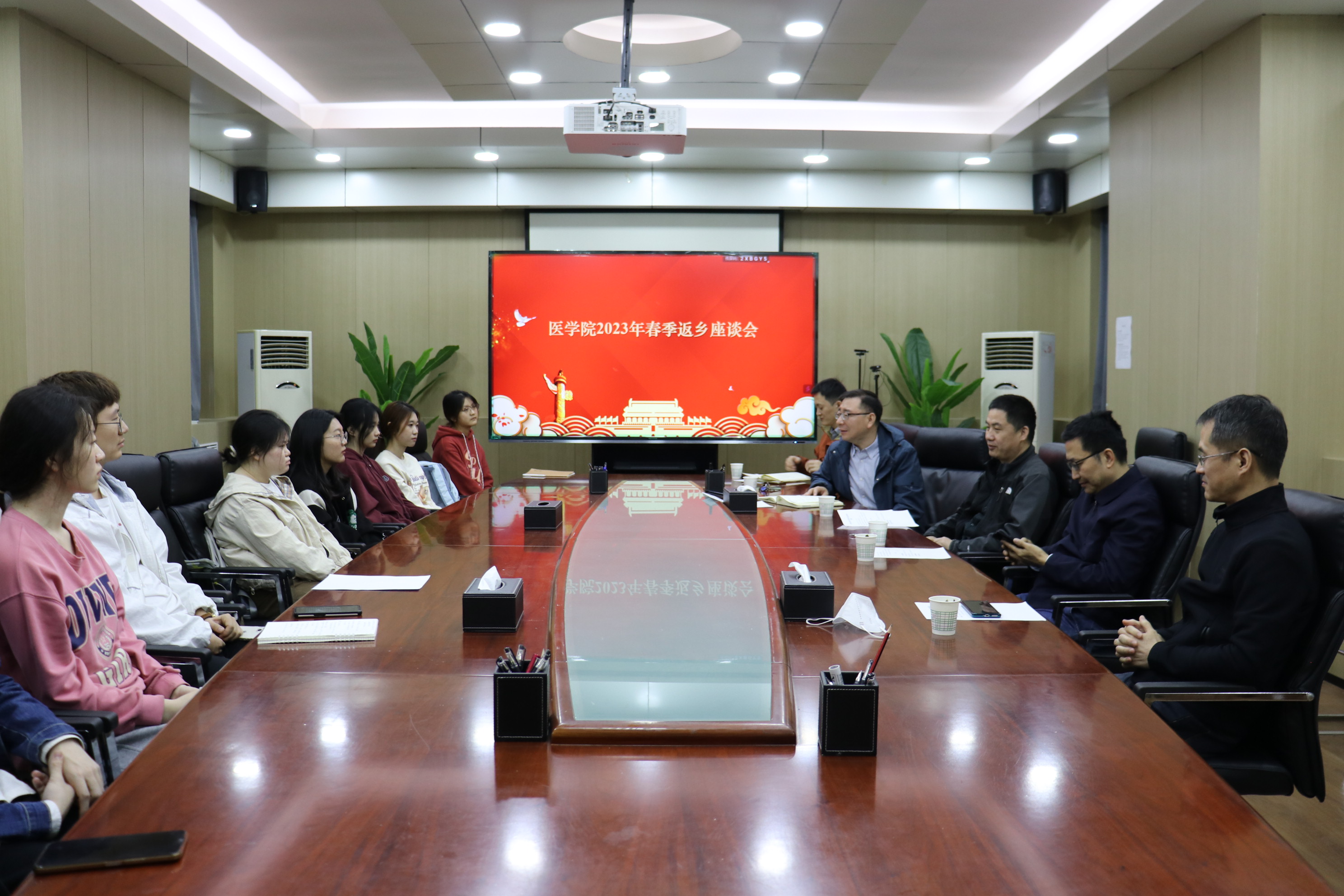 3月9日,YABO鸭脖官网组织召开2023年春季返乡座谈会, 2022级临床医学班主任田晔、口腔医学班主任杨振华、生物医学科学班主任张晓军及各年级学生代表、学工干部共同参加,会议由学院党支部(直属)副书记杨涛主持。