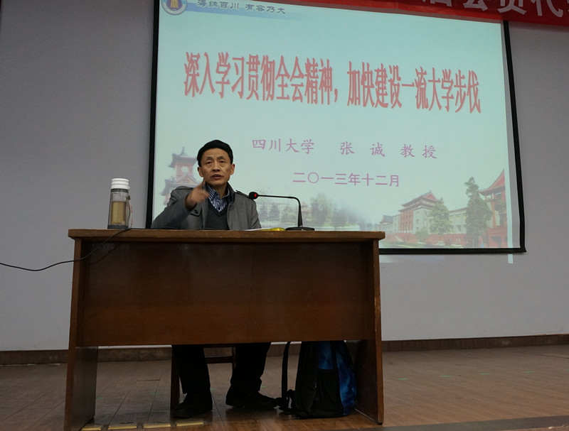 张诚教授以“认真学习贯彻全会精神,加快一流大学建设步伐”为题,从“全会特别重大的意义、深化改革的总目标、路线图和重大举措、联系实际贯彻全会精神的思考”三个方面,结合生动活鲜的事例,系统宣讲了党的十八届三中全会的主要精神。