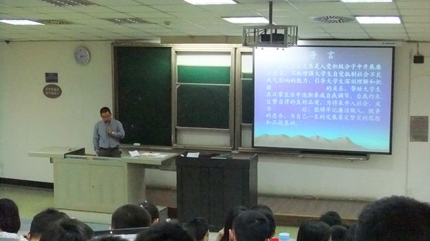 廖爱民老师首先从大学生开展廉洁教育的时代背景和历史背景进行阐述,指出大学生开展廉洁教育的重要性和必要性。说明大学生廉洁教育是党中央加强大学生思想教育的一项英明决策,具有重大而深远的战略意义。接着,廖爱民老师简要回顾了在党中央的领导下,各级纪检监察部门开展的党风廉政建设活动,尤其是在惩治和预防腐败方面做出的巨大努力和突出成绩,坚决查处了薄熙来、刘志军、许宗衡等一批重大违纪违法案件,表明了我们党反对腐败的坚强决心。廖爱民老师又进一步向同学们讲解,我们现在的腐败行为不仅在政府高官,国企高管中频频出现,而且,高校校园也并非净土,原本作为清水衙门的象牙塔大学校园开始沾染腐败气息。以前高校一直被人们视为做学问、搞研究的“净土”,既没有行政权力,也不投资运营。然而,近年来,高校在招生录取受贿、校园建设、贪污受贿、学术腐败等各方面已成为职务犯罪新的高发区。廖老师列举了许多案例说明部分高校的领导、专家学者违规违纪,并最终因触犯法律而被移送司法机关。
