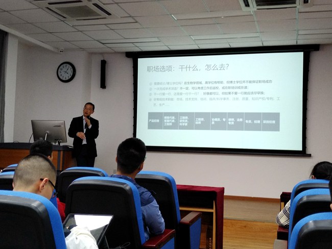 俞翔博士以自己读书和就业经历切入,之后分别从生物技术的应用、生物技术企业解剖、从学校到企业-怎么去、生物技术的应用四个方面给大家分享生物技术的范畴和生物技术的实际应用。最后,在场的同学对关心的生物公司就业问题向俞翔博士提问,俞翔博士十分耐心地给予了解答。讲座现场氛围热烈,得到同学们的高度认可。