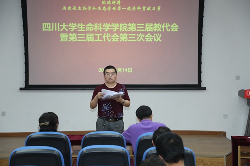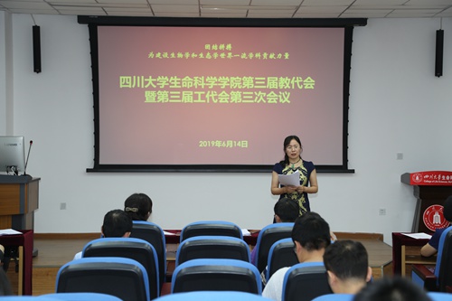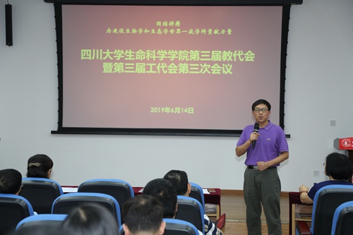 2019年6月14日下午14时30分,3003新葡平台第三届教代会暨第三届工代会第三次会议在生命科学楼B区学术报告厅召开。本次会议主题为“团结拼搏 为建设生物学和生态学世界一流学科贡献力量”。学院党政班子成员、第三届双代会正式代表出席了本次大会。会议由学院党委副书记吴近名主持。