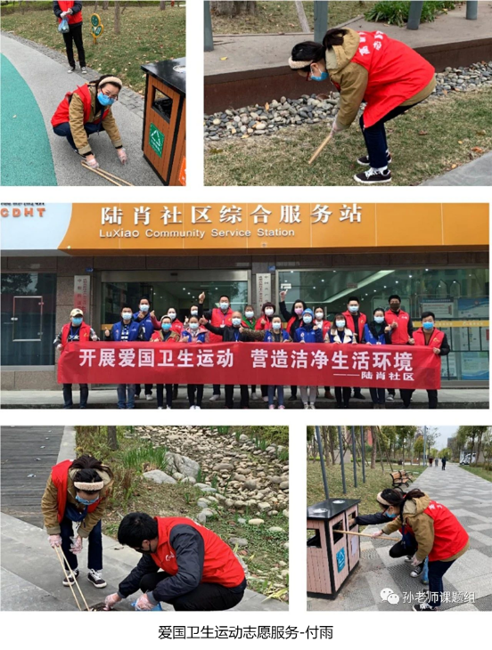 此外,同学们的作品也表现出了奉献精神和关心疫情的家国情怀。其中,付雨同学投身于社区志愿者工作,开展爱国卫生运动,为居民塑造洁净的生活环境贡献自己的力量。