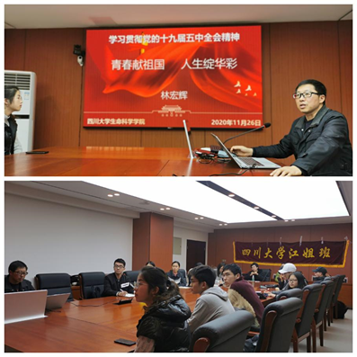 2020年11月26日晚7:30,3003新葡平台党委书记林宏辉围绕“学习贯彻党的十九届五中全会精神”给“江姐班”全体同学讲授了一次别开生面的党课。在本次党课上,林书记就“‘十三五’期间我国取得的主要成就”、“我国发展环境面临的复杂变化”、“到2035年要实现的九个目标”、“‘十四五’期间经济社会发展的主要目标”、“实现奋斗目标的十二方面具体举措”做出了深入的讲解,并强调“江姐班”的学生要以成为未来生物科学领域领军人物而不懈奋斗,青年学子要将个人发展梦想与国家民族前途深度融合,坚定理想信念,用创新书写报国之志,为建设社会主义现代化国家努力奋斗。