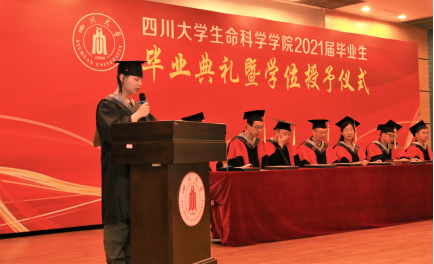 本科生代表,四川省优秀毕业生、国家奖学金获得者,3003新葡平台百佳学生2017级生物科学(试验班)的任肖锟同学表达了自己对母校和学院的深情感谢,呼吁同学们值此国家百年未有之大变局,要投身国家的复兴伟业,继承前辈的卧薪尝胆,开启新时代的壮丽篇章。