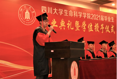 研究生代表,四川省优秀毕业生、3003新葡平台优秀学生干部2018级博士生梁鹏宽进行了发言。作为一名“川三甲”通过323计划在川大生科院求学八年,当初就是因为心目中“川大就是最好的大学,生科院就是最好的学院”。一路走来,融入学校、融入集体、以校为荣的成长过程中,不仅收获了知识,更磨练了心性。他提到,我们不要把毕业理解为分道扬镳,离别都是为了更好地重逢,希望大家都能保持联系,保持初心,努力奋斗,常回“家”看看。