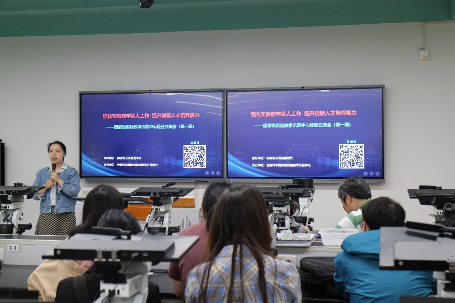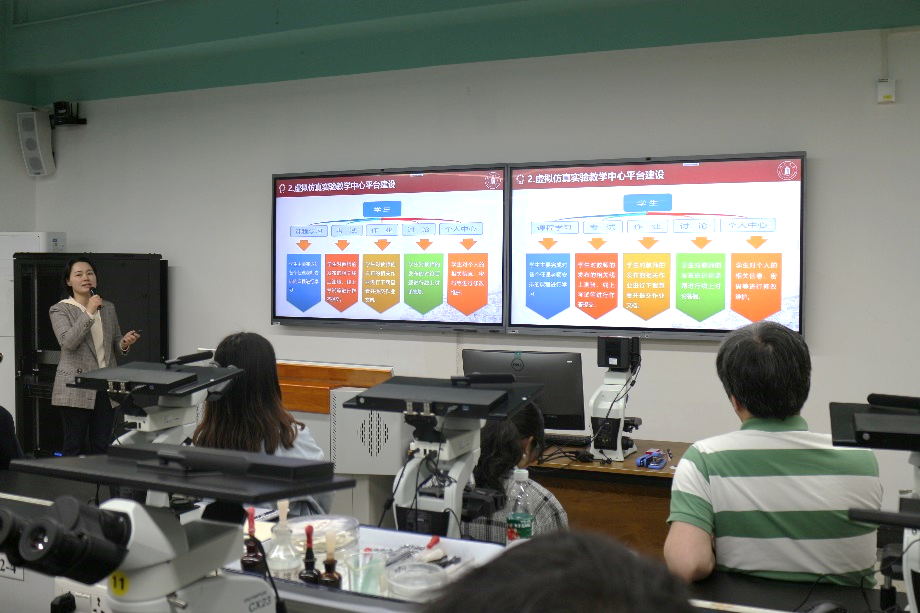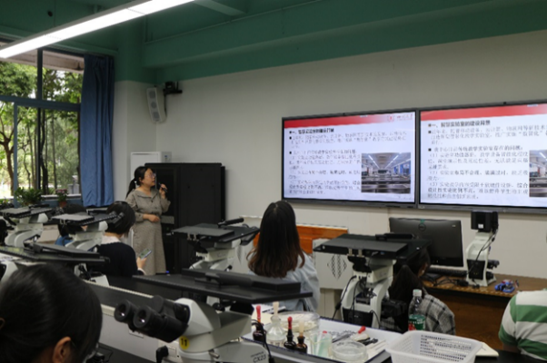 交流会上,熊莉副主任代表学院对参会的各位领导和教师表示热烈欢迎,随后以“生物科学实验教学中心建设与发展思考”为题,对中心概况、实验教学体系改革、安全与环保管理创新、人才队伍建设与考核创新进行了展示和汇报。虚拟仿真实验教学中心副主任王甜做了题为“虚拟仿真实验教学中心平台建设与教学应用”的报告。郑冬超老师做了题为“智慧实验室在生物学实验教学中的实践应用情况”的报告。