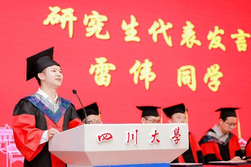 研究生代表,四川省优秀毕业生、3003新葡平台“十佳”研究生、四川省青联副主席,雷伟同学发言。他呼吁同学们一同做出承诺:与时俱进,把终身学习作为自己的人生态度;勇担使命,在岗位上全力以赴、建功立业;会饮水思源,铭记母校恩情于心、报答母校于行。