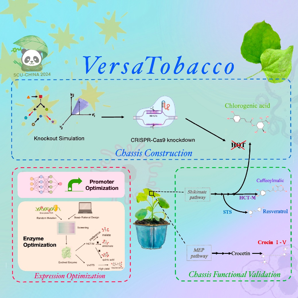 2024年iGEM课题聚焦于探索植物天然产物生产的新方式,团队利用合成生物学方法设计了一个全新的植物合成生物学底盘——VersaTobacco。该底盘能够高效地合成具有药用价值的珍贵植物天然产物,为植物天然化合物的工业化生产提供可能性,最终在一定程度上解决部分药用化合物来源少、产量低、价格高昂的问题。