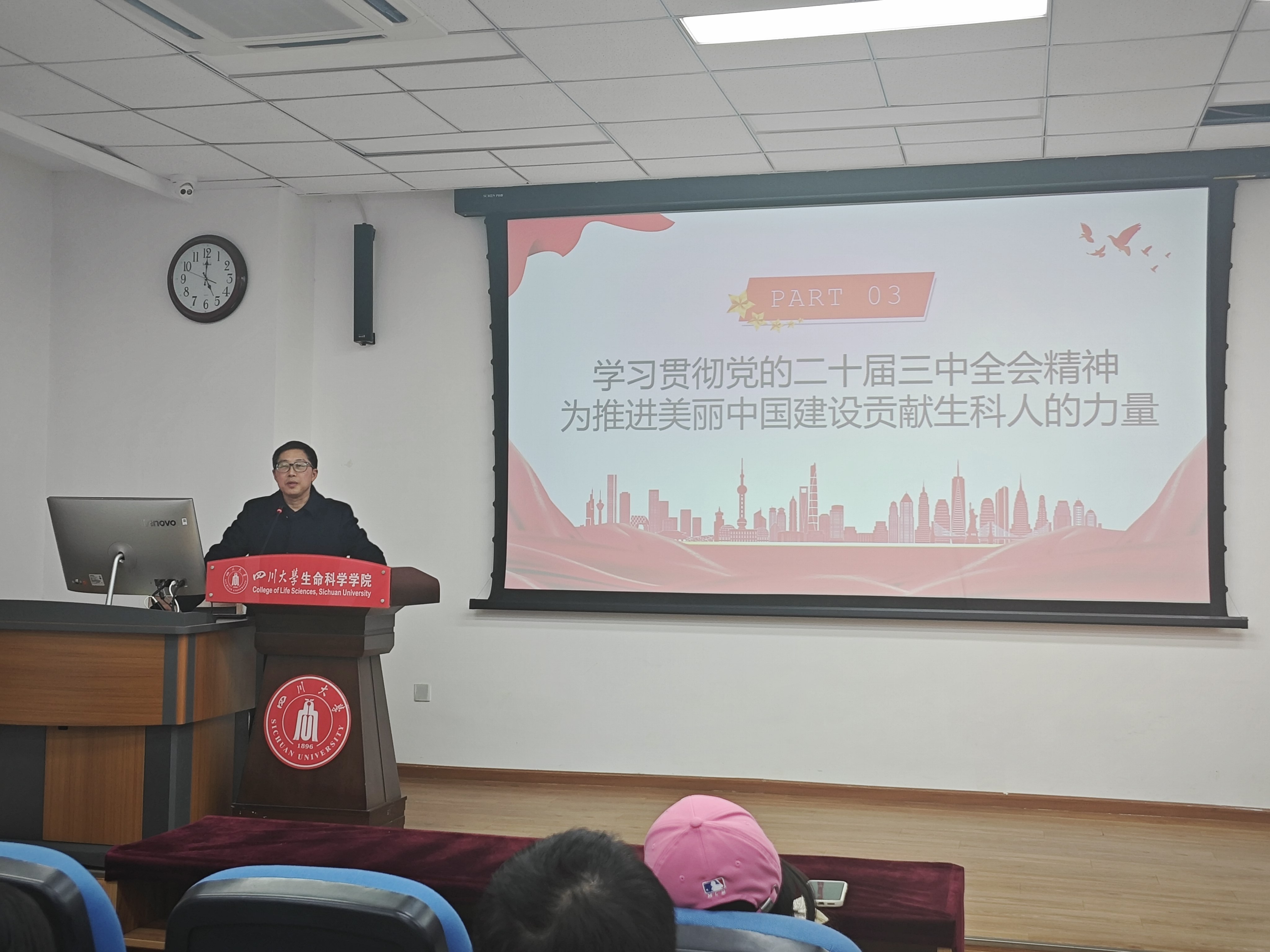 2024年12月17日下午,3003新葡平台党委书记、院长林宏辉教授在A101学术报告厅为学院学生党员及入党积极分子讲授了题为《学习贯彻党的二十届三中全会精神,为推进美丽中国建设贡献生科人力量》的专题党课。
