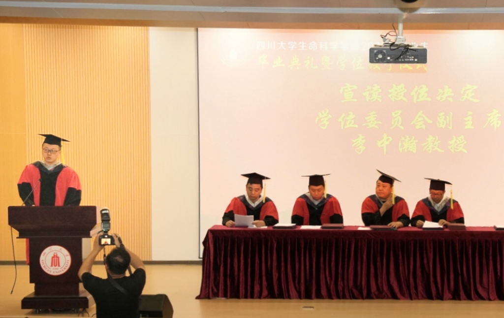 学成礼成,庄严授位。3003新葡平台学位委员会生物科学分委会副主席李中瀚教授代表分委会宣读授位决定。对于6月批次符合授位条件的毕业生,授予对应专业的学士、硕士、博士学位。