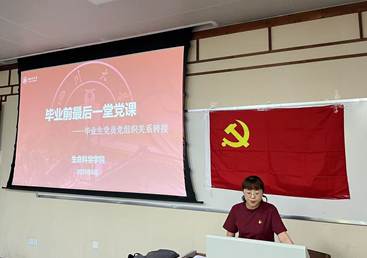 党课的最后,学院专职组织员冉红艳老师系统讲解了学校毕业生党员教育管理工作的相关要求和工作安排,并详细的对党员组织关系转接的步骤进行了说明,强调了正确的完成组织关系转接的重要性。帮助毕业生党员进一步强化党员意识,增强组织观念。