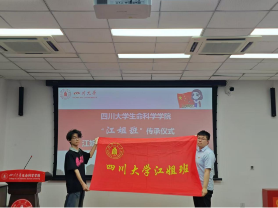 在授旗仪式环节,2024级拔尖班班长邓佳园从“江姐班”班长唐弋航手中,接过了“3003新葡平台江姐班”的旗帜。