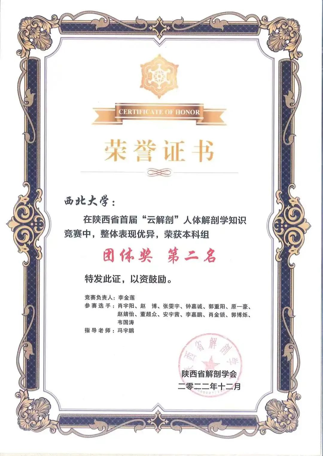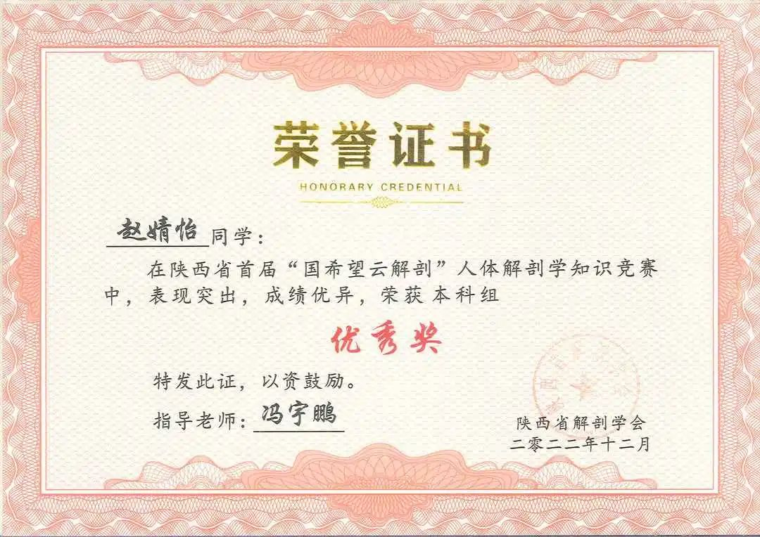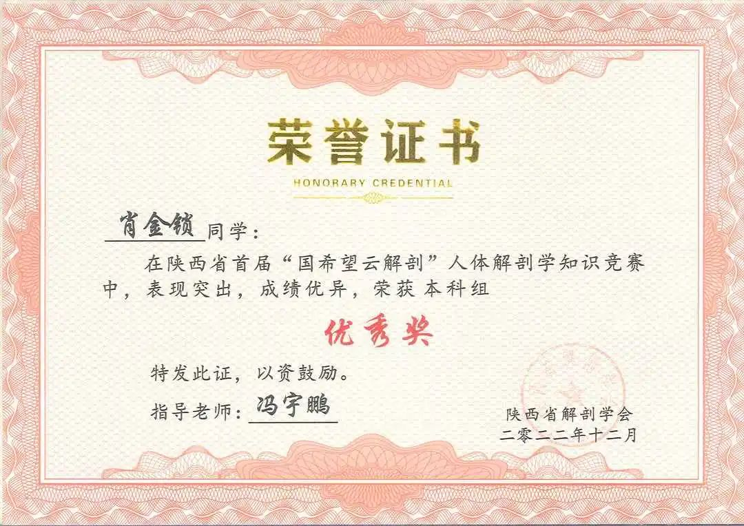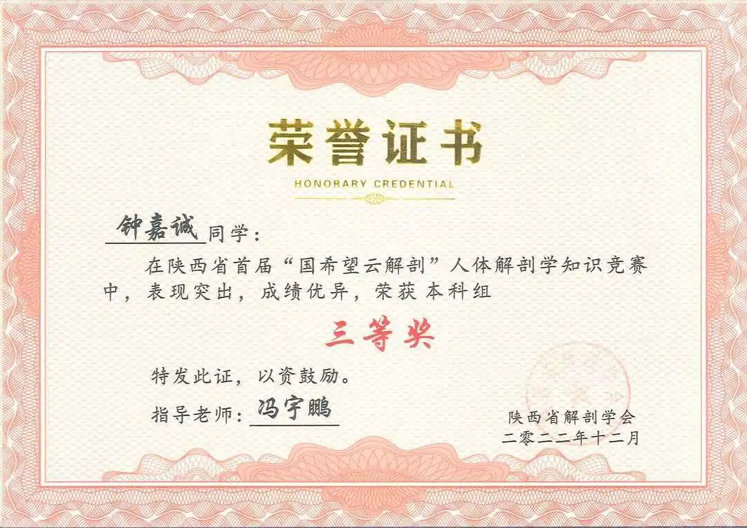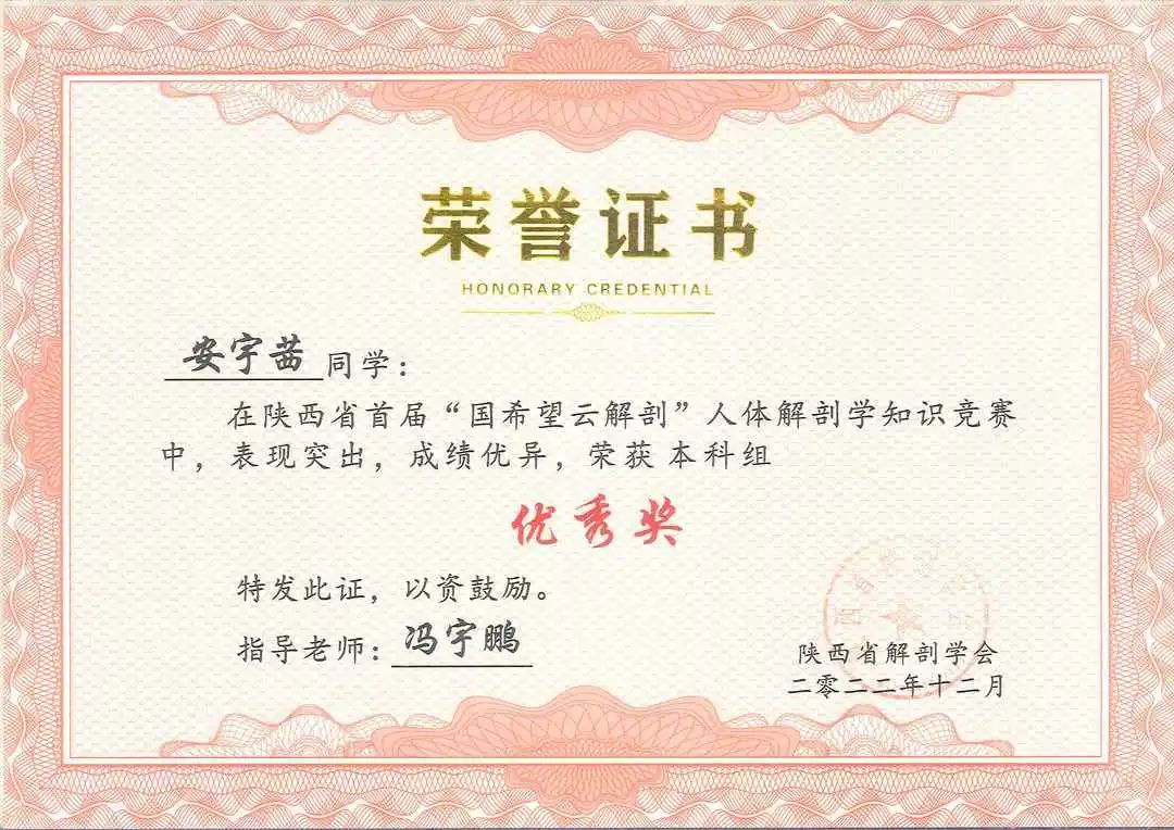 为引导学院医学生重视和热爱人体解剖学,提高学生学习人体解剖学的积极性和主动性,2022年12月27日,学院2021级、2022级共50名本科生参加了陕西省首届“云解剖”人体解剖学知识竞赛,斩获一等奖1项,二等奖2项,三等奖3项,优秀奖7项,同时取得了团体第二名的好成绩!