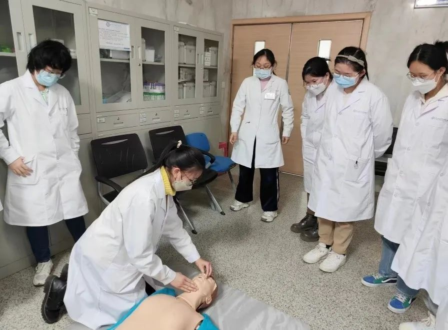 见习期间,临床医学班在科室负责医生的指导下,参观学习了急诊室各功能区,了解了科室场地设置人员配置、排班设备设施、患者就诊流程等情况。在急诊门诊、急诊抢救、急诊病房区域,同学们观摩了急诊科室早交班工作,学习了临床坐诊过程中患者就诊流程及病情诊疗经过。见习过程中,带教老师进行了心肺复苏,电除颤操作、监护仪使用、无菌手套佩戴等临床技能培训。‍