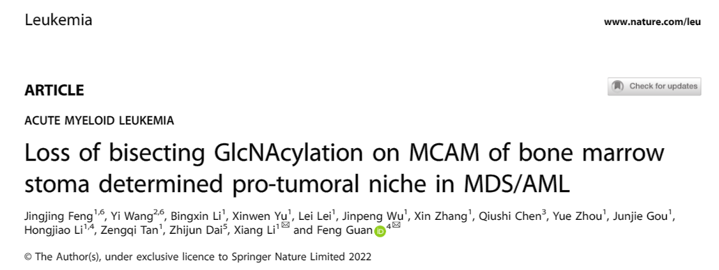 近日,YABO鸭脖官网生命科学学院关锋/李想教授团队在基质细胞中bisecting GlcNAc影响黏附因子MCAM表达并重塑骨髓增生异常综合征(MDS)或急性髓系白血病(AML)骨髓微环境的机制研究中取得新进展。研究结果以研究长文(Article)形式发表在血液肿瘤学权威期刊《Leukemia》杂志上,题名为"Loss of bisecting GlcNAcylation on MCAM of bone marrow stoma determined pro-tumoral niche in MDS/AML"。