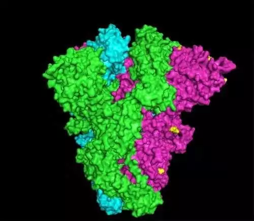 (红绿蓝代表组成锥状S蛋白的三个亚基结构,白色棒状结构为S蛋白表面复杂的N-糖链结构,黄色为S蛋白上参与唾液酸糖链结合的区域)