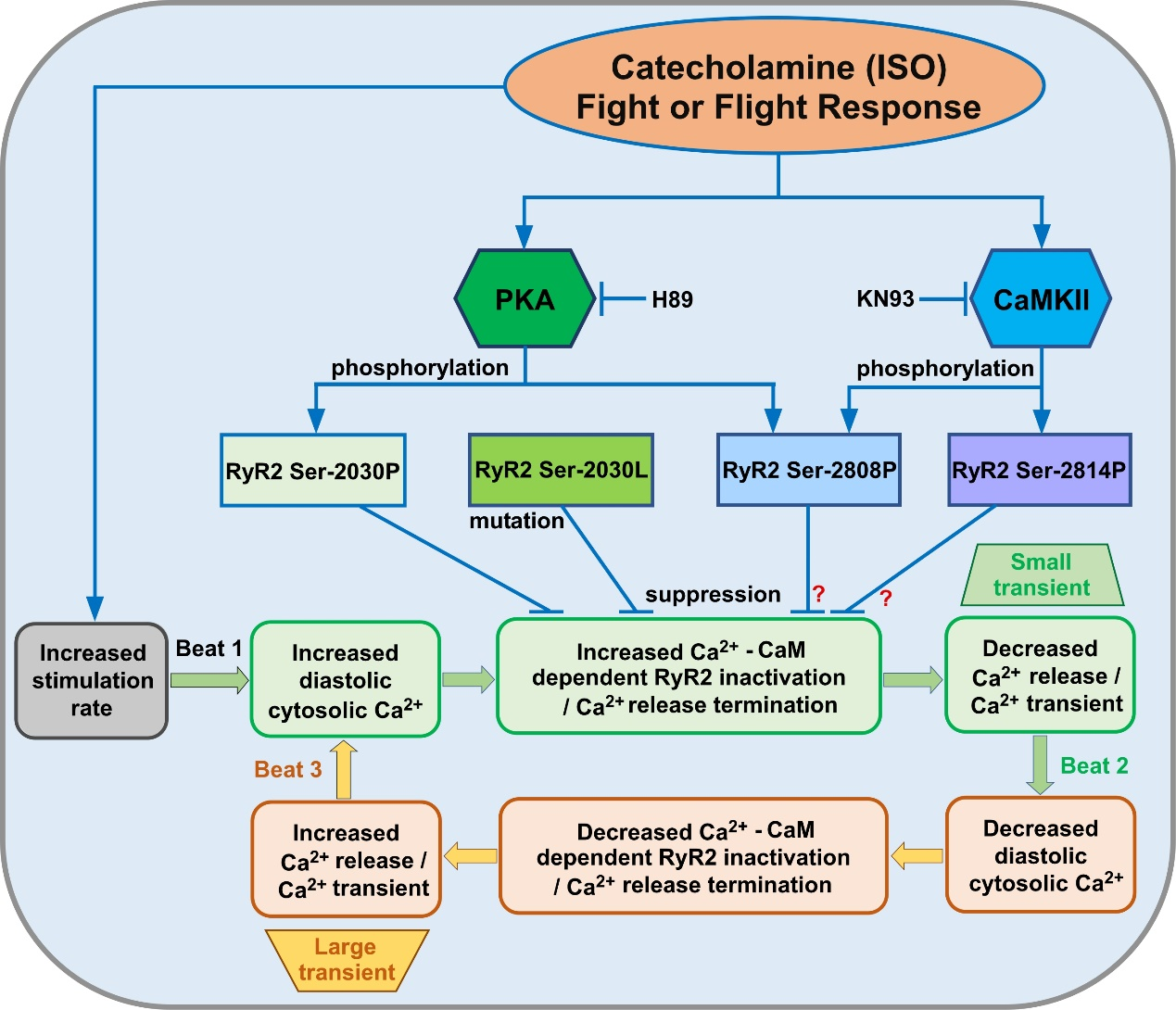 魏金红副教授及其研究团队使用单细胞内质网Ca2+成像技术,系统评估了S2030突变对HEK293细胞Ca2+释放终止的影响,并发现了S2030L突变消除了CaM-WT、CaM-M和PKA在Ca2+释放终止中的作用,但没有改变CaMKII的作用。为确定PKA位点RyR2-S2030在生理环境中的作用,研究团队建立了一种带有S2030L突变的新型小鼠模型。通过使用共聚焦Ca2+成像,发现了:异丙肾上腺素和CaM-M抑制起搏诱导的Ca2+瞬变交替并加速心脏Ca2+的瞬时恢复能力,而CaM-W则发挥相反作用;异丙肾上腺素的影响分别被PKA抑制剂H89部分逆转,被CaMKII抑制剂KN93完全逆转;S2030L消除了异丙肾上腺素的CaM-WT、CaM-M和H89依赖性影响,但没有消除KN93的影响。