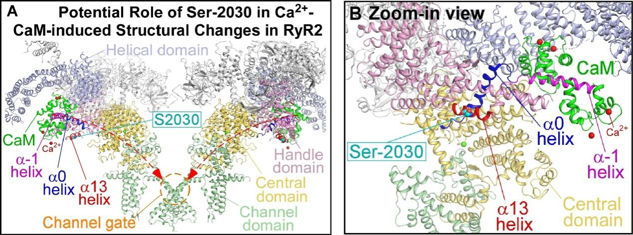 蛋白激酶A(PKA)介导的心脏兰尼碱受体(RyR2)磷酸化已被广泛研究数十年,但目前对RyR2的PKA磷酸化的生理学意义仍知之甚少。魏金红副教授基于前期对钙调蛋白(CaM)复合的RyR2高分辨率三维结构的测定,发现RyR2的主要PKA磷酸化位点丝氨酸2030(S2030)位于RyR2的CaM依赖性失活的结构途径中(图A,B)。这种新颖的结构提示了RyR2的PKA磷酸化在CaM依赖性RyR2失活中可能发挥的重要作用
