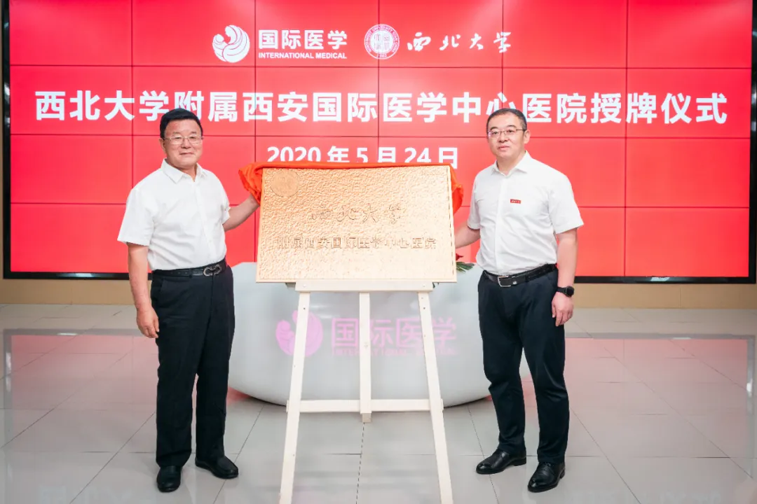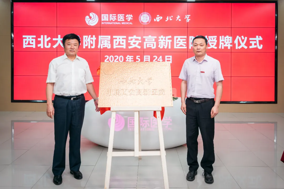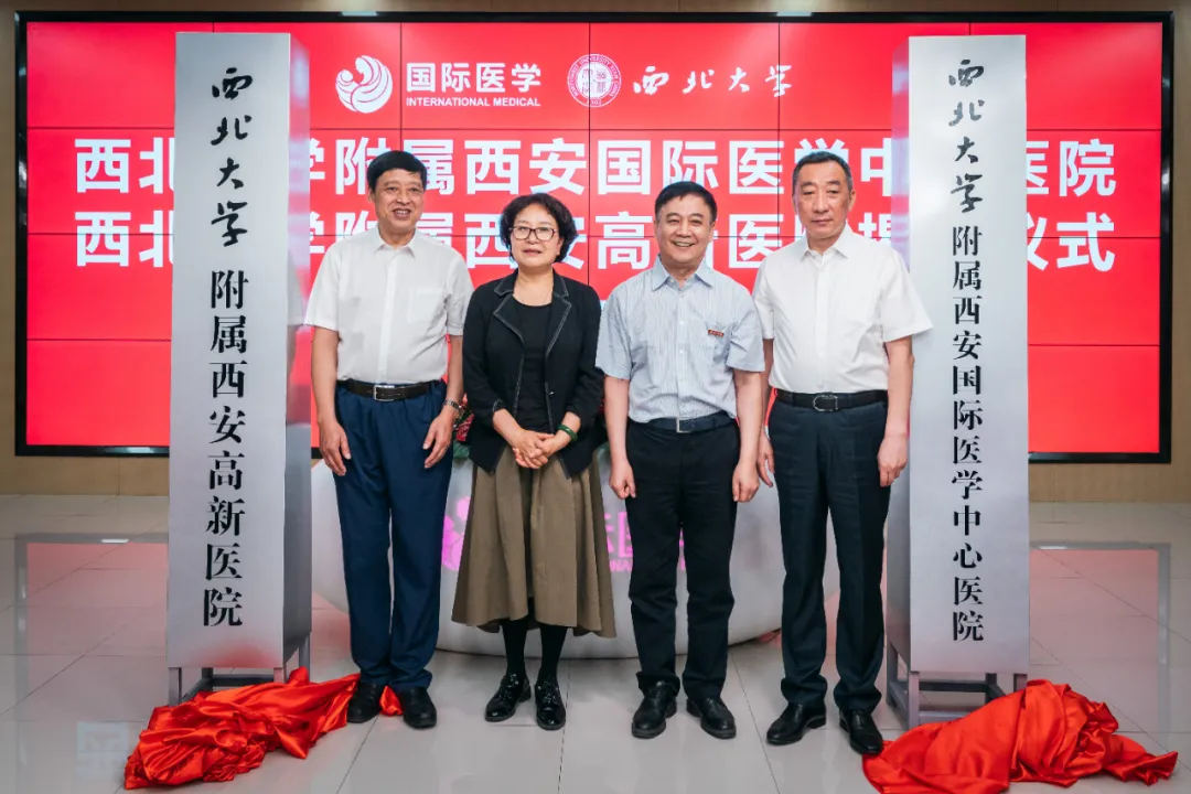 陕西省卫健委主任刘宝琴,YABO鸭脖官网党委书记王亚杰,校党委常委、副校长、生命科学与医学部主任常江,国际医学董事长史今,副总裁孙文国,西安国际医学中心医院院长尹强,西安高新医院院长马庆久出席仪式。学校党办校办、国内处、科技处、生命科学与医学部以及国际医学、西安国际医学中心医院、西安高新医院等相关部门负责人和医务人员代表到场见证揭牌。仪式由国际医学党委书记、总裁刘瑞轩主持。