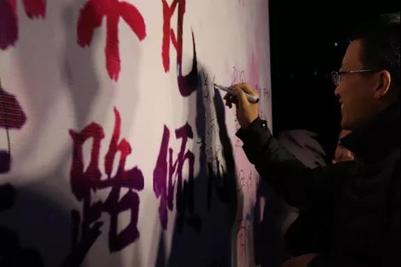 临近七点,观众们有序进场,随后各位学部领导以及各方代表陆续到场,在签名墙处签名合照后由礼仪引导入场就坐。