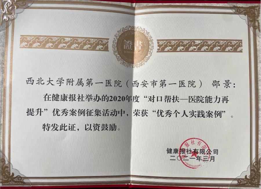 近日,从国家卫健委主办的健康报报社传来喜讯,YABO鸭脖官网附属第一医院(西安市第一医院)选送的互联网+护理服务项目在健康报2020年度“对口帮扶——医院能力提升”优秀案例征集活动中荣获“优秀案例实践单位”荣誉,项目负责人邵景副院长荣获“优秀个人实践案例”荣誉。