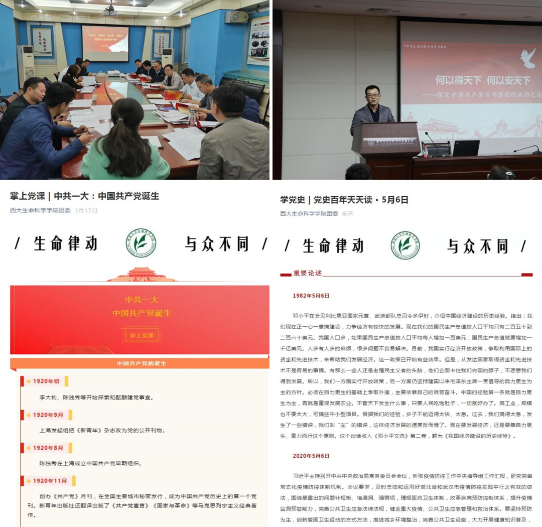 百年沧桑百岁庆,不忘初心启征程。生命科学与医学部将深入推进党史学习教育,从红色党史中汲取奋进力量,在专业服务中坚定理想信念,增强奋进信心,站稳人民立场,干实事、解难事、做好事,激励师生坚定育人育才的办学初心,牢记繁荣西大生命科学与医学教育事业的使命,以昂扬的姿态奋力开启新征程,实现新作为。