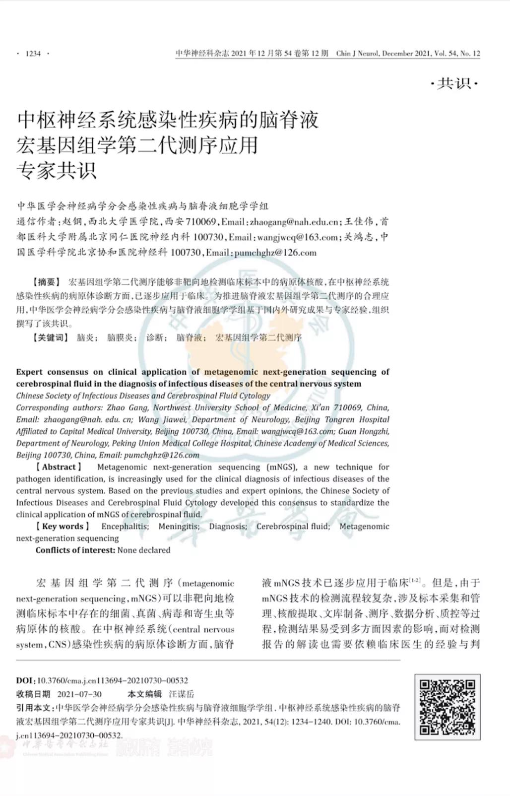 2021年12月15日,由鸭脖官网院长赵钢教授牵头,联合中国医学科学院北京协和医院、首都医科大学附属同仁医院及上海复旦大学附属中山医院等共44家单位53位相关领域的顶级专家,共同起草撰写的“中枢神经系统感染性疾病的脑脊液宏基因组学第二代测序应用专家共识”,在《中华神经科杂志》上正式发表。该专家共识是在赵钢教授团队牵头的2016年科技部重大精准医学项目——基于组学特征谱的脑(膜)炎病因分型诊断研究——历时五年不断研究探索的基础上总结凝练而成,是临床标志性、纲领性的重要指导规范。