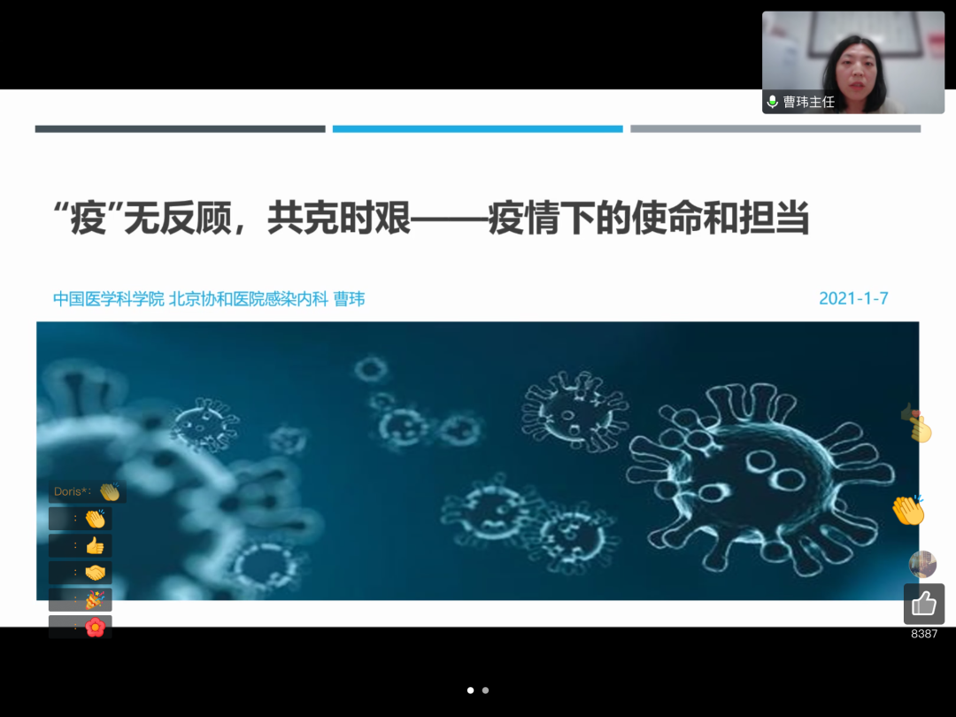 1月7日晚,YABO鸭脖官网医学战“疫”大讲堂在腾讯会议端开讲,北京协和医院感染内科副主任、2020年初国家援鄂抗疫医疗队队员曹玮医生做客讲堂,作题为——“‘疫’无反顾,共克时艰,疫情当下我们的使命与担当”分享报告,全校师生在线观看。讲堂由生命科学与医学部主办,校党委副书记张清主持。