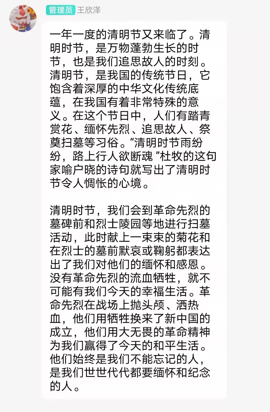 清明时节,我们会到革命先烈的墓碑前和烈士陵园等地进行扫墓活动,此时献上一束束的菊花和在烈士的墓前默哀或鞠躬都表达出了我们对他们的缅怀和感恩。没有革命先烈的流血牺牲,就不可能有我们今天的幸福生活。革命先烈在战场上抛头颅、洒热血,他们用牺牲换来了新中国的成立,他们用大无畏的革命精神为我们赢得了今天的和平生活。他们始终是我们不能忘记的人,是我们世世代代都要缅怀和纪念的人。