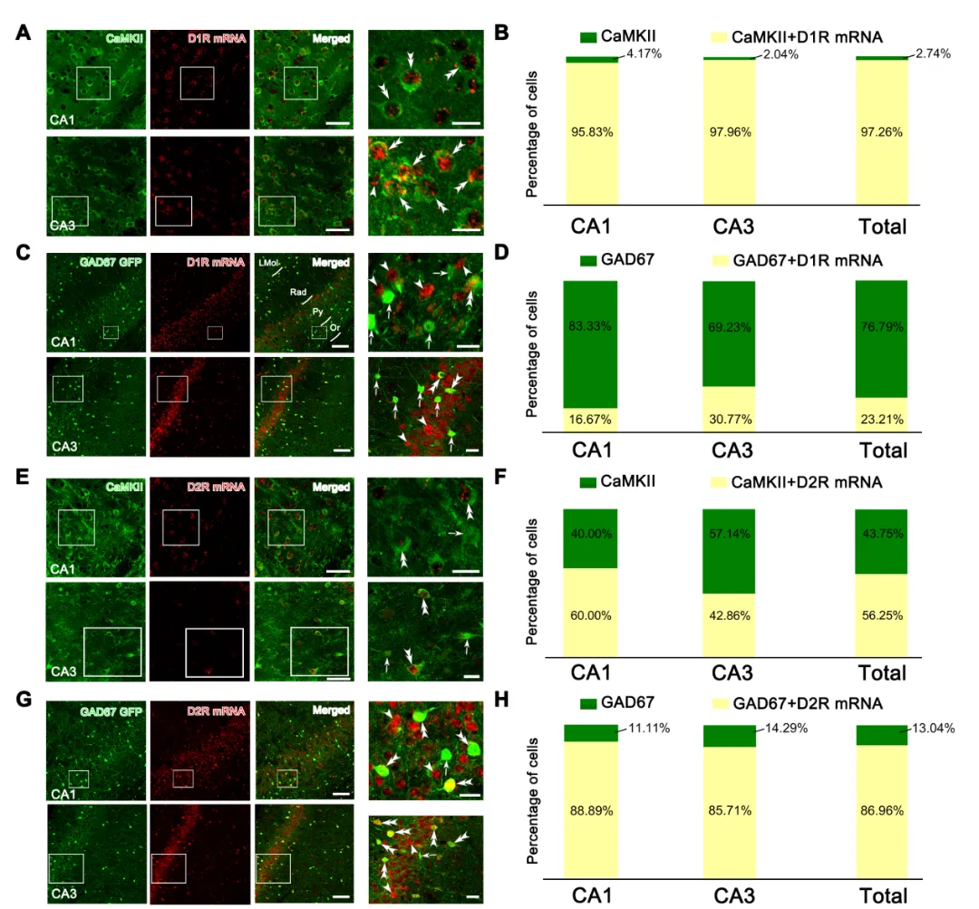 图4 D1R和D2R在vHPC内谷氨酸能和GABA能神经元上的表达情况