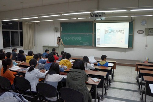 大会开始,首先由POP协会创作部长章杰伦为新干事讲解关于POP的知识,如:POP的定义、制作POP的产用工具等。又通过幻灯片详细讲解了手绘POP入门教程——POP字体装饰,讲解了字体装饰的多种方法,如:外勾边、内填色、打彩底、裂纹等。章杰伦学长讲话生动风趣,内容讲得非常精彩,干事们听得津津有味,看得十分投入,待学长讲解完后便专注地在自己的铜版纸上反复练习领悟。接着副部长吴俊杰亲自写作了一幅POP字以作示范,接下来会长张嫣之提出以副部长写的示范POP作为奖品,邀请几名干事上黑板现场写作POP并评比,评出的第一名将获得奖品。看到学长写的POP精美无比,干事们都踊跃举手参与,希望获得奖品,最终一位女生胜出并获得了精美奖品。互动结束后,大会进入最后环节,主持人上台做大会总结,对应邀来到大会的学姐学长表示感谢,并鼓励各个干事将来能够画出精美的海报。