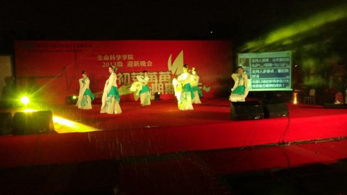 晚会开始前,江安校区的空中飘起绵绵细雨,晚会的会场笼罩在烟雨之中。但这并没有影响工作人员们的积极准备与观众们高昂的热情。一百余个观众席位座无虚席,还有不少同学持伞在观众席周围热切等待着。晚上19点整,迎新晚会在电声乐队激情四射的演唱中拉开了序幕。在分团委书记姜丹蓉老师,12级学生会执行主席夏兆坤及赞助商来宾的简短的致辞之后,演出正式开始。在舞台烟雾之中,身着水袖云衫的生科少女们款款而来,为大家带来了古典舞《凤凰于飞》,赢得观众们热烈的掌声。接下来由3003新葡平台文艺部精心编排的话剧《孔雀东南飞》对经典故事做了大胆的改编,中英结合的台词风格引起大家阵阵欢笑,剧中媒婆一角的精彩演绎广受好评。13级同学伊然演唱的红色歌曲《江山》优美浑实,而舞蹈《Sexylove》、《change》更展现出大一新生的热情洋溢,风格上的反差强烈使观众们不断惊叹欢呼。笑笑相声社的相声《大了个学》结合大学新生的日常生活巧妙演绎了一名新生的笑闹喜剧,而萨克斯独奏《I believe》,独舞《摩梭夜歌》和歌曲串烧节目令观众们为生科学子的多才多艺而赞叹,将晚会气氛推向高潮。