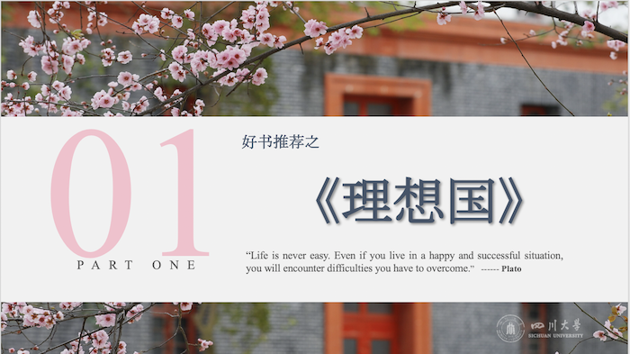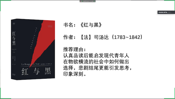 在此次线上分享会中,各组代表均通过精美制作的PPT为同学们带去了“好书盛宴”。一组代表曹子铭分享了《红与黑》与《平凡的世界》,希望能帮助大家塑造品格、判断是非、感悟历史。二组代表王佳玉推荐了《一句顶一万句》,从上个世纪人们的生活方式里分析了孤独,感受到了交流的重要性。三组成员带来了《习近平的七年知青岁月》与《挪威的森林》,希望同学们能从探寻人生意义的角度去感受奋斗的价值,勇于成长、突破束缚,走出属于自己的道路。四组代表刘晓亮结合《月亮和六便士》和其抗疫期间的见闻经历,深切地表达了自己作为生科学子,愿以科研报国、实现中华民族伟大复兴的目标与渴望。最后,“江姐班”代表杨子霆分享了《理想国》,并结合书中极富哲学内涵的观点做出了思考,她认为,作为未来的生物科研工作者,同学们应更多地着眼于创新生物技术,在国家生物安全体系建立方面做出贡献。