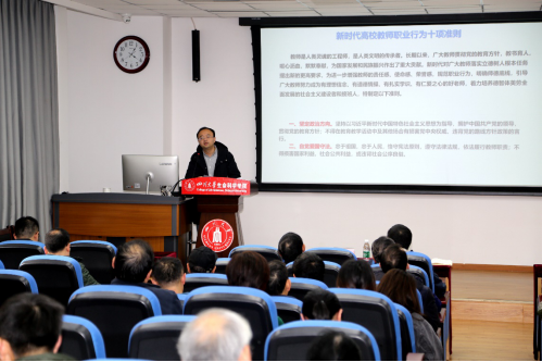 本次学习活动贯彻落实习近平总书记“评价教师队伍素质的第一标准应该是师德师风”的重要指示,聚焦“不忘初心、牢记使命”主题教育,学习“新时代高校教师职业行为十项准则”。吴近名副书记对“高校教师职业行为十项准则”的背景进行了全面分析,依据国家重要会议、文件精神,对新时代高校教师职业行为十项准则的内容,并结合“发布错误言论”“师生关系”“学术不端”等几类典型师德失范行为案例,对教师职业行为的“底线”“红线”进行了细致论述。最后从“高校师德建设主体责任”“师德失范行为处理方式”“师德失范行为处理机制”三个层面对高校教师职业行为准则的实施进行了具体讲解。