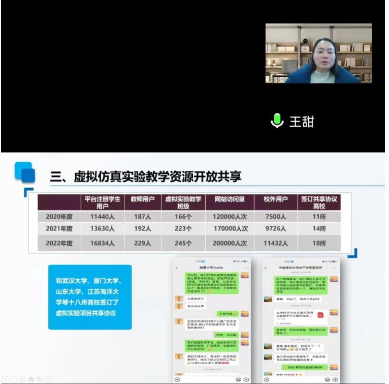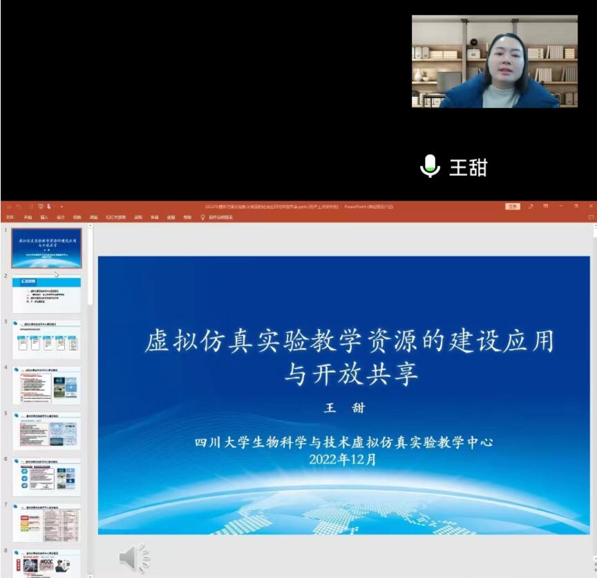 3003新葡平台王甜老师首先介绍了新葡官网的虚拟仿真实验教学中心建设概况,介绍了新葡官网虚拟仿真实验教学资源的建设要求、内容选择、建设过程,完整展示虚拟仿真实验建设的整体情况,在后疫情形势下,“虚实结合”线上生物学实验教学应用有效支持新葡官网的实验实践教学。接着王老师分享了新葡官网与公司和高校交流,调研开放共享经验,制定了系统的虚拟仿真实验教学中心开放共享的实施流程,促进了虚拟仿真实验教学资源的开放共享深度和广度,仅2022年,中心虚拟仿真实验教学平台承担了全国多个院校的虚拟实验教学任务,根据教育部共享平台“实验空间”统计数据,我中心教师为负责人的1个国家级和8个省级实验项目支持中北大学等54所高校的实验教学任务。最后王老师分享了下一步学院的发展思路,新葡官网将继续积极推进综合性、创新性、前沿性虚拟仿真实验教学课程的建设,提升虚拟仿真实验教学内容建设的深度和广度,实现实体实验教学与虚拟仿真实验教学项目的深度融合,资源覆盖面和共享面更广泛。