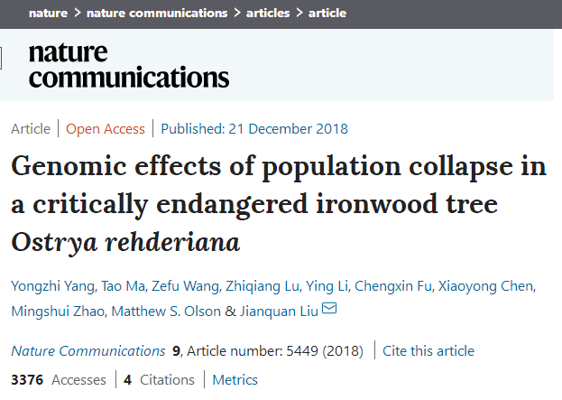多数树种是异交的,因而理论预测濒危树种由于近交抑制(自交或近交导致不产生后代或后代生存力快速降低)会快速灭亡。上世纪九十年代科学家预测濒危树种及其它濒危植物会在2015年前大规模灭绝和消失。但Science 2016年发文指出,二十年后的实际监测发现只有少数物种灭绝,其中的原因不清楚。刘建全教授课题组选择铁木属的两个近缘种进行研究。一个濒危种只有五棵野生植株,局限分布在天目山;另一个种广布于西南山地和东部地区。他们通过全基因组水平的群体遗传学和野外调查研究发现:两个物种有效群体大小均在第四纪冰期开始下降;但广布种在冰期结束后有效群体大小迅速回升,而濒危种有效群体大小在冰期结束后的全新世以来继续下降;濒危种基因组上的有害突变总体上增加,且自然结实有不育发生;但仍然存在正常结实。令人惊讶的是濒危种中极端有害突变比广布种明显减少了。因此,长时间特续的有效群体大小下降导致近交抑制减弱,加上极端有害突变减少,使该频危树种还能结实,垂而不死,继续生存。3003新葡平台刘建教授全课题组自聘工作人员杨勇志博士和马涛教授为并列第一作者,刘建全教授为通讯联系人,兰州大学、华东师大、浙大、天目山自然管理局和美国德克萨斯理工学院的相关研究人员参与了该工作。
