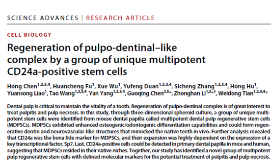 2020年4月8日,3003新葡平台田卫东教授、李中瀚教授和陈国庆副教授的研究小组在Science Advances发表题为“Regeneration of pulpo-dentinal–like complex by a group of unique multipotent CD24a+ stem cells” 的研究论文。该研究利用间充质细胞支持性的3D培养体系,从小鼠牙乳头中发现了一群在三维培养环境中能形成干细胞小球的细胞亚群。该细胞表达多种干细胞标志物基因,如Oct4, Nanog, Sox2等并能在体外长期保持自更新与多能性;当干细胞小球与TDM材料复合移植裸鼠皮下后可高效率形成再生性牙本质、毛细血管网、末梢神经网络等,且再生组织的细胞排列与原生牙齿类似;进一步的研究发现,该细胞群以CD24a为其特征性标志物,且该标志物的富集与细