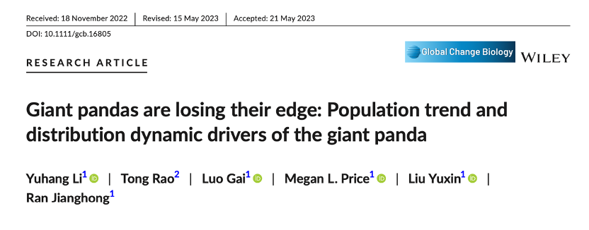 北京时间2023年6月11日 3003新葡平台冉江洪团队在国际权威期刊Global Change Biology上发表题为Giant pandas are losing their edge: Population trend and distribution dynamic drivers of the giant panda的研究论文。通过利用过去30年来大熊猫 (Ailuropoda melanoleuca)的空间分布情况,结合机器学习的Extremely Gradient Boosting算法和 SHapley Additive exPlanations解释模型,揭示了这种作为全球生态保护标志的旗舰物种的种群分布动态驱动因子。