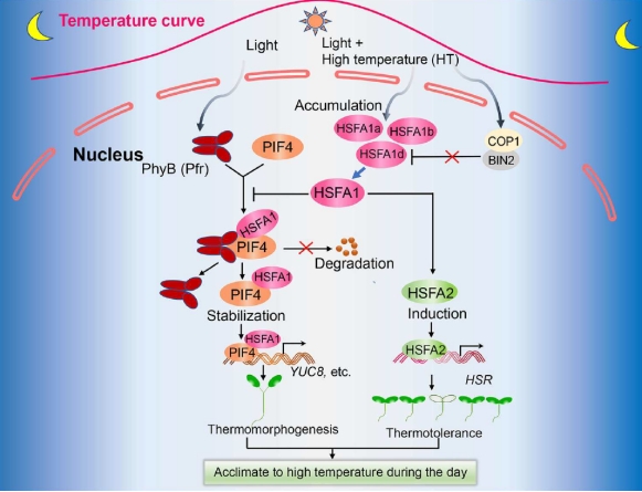 基于以上结论,该研究提出了植物适应白天高温的调控模型(图2)。在白天的高温条件下,一方面28℃高温在光下诱导HSFA1s蛋白大量积累,另一方面高温诱导COP1进入细胞核抑制BIN2与HSFA1s的结合,从而促进HSFA1s进入细胞核;在细胞核内,HSFA1s通过与PIF4形成稳定的蛋白复合体阻止PIF4被光激活形式的phyB降解,从而促进光下的热形态建成过程。此外,HSFA1s还可以诱导HSFA2在白天高温环境下表达,使植物获得较强的高温胁迫耐受能力,说明HSFA1s作为核心调控元件控制着“热形态建成”和“热胁迫响应”两个过程。该研究揭示了植物白天热形态建成调控的新机制,进一步完善了植物响应不同高温信号的调控网络。