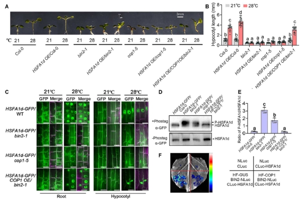 此外,研究结果还显示在光下28℃高温不能诱导BIN2功能获得型突变体bin2-1以及COP1缺失突变体cop1-5背景上的HSFA1d入核,说明白天高温诱导HSFA1d进入细胞核还依赖于COP1并受到BIN2的抑制。进一步研究发现,COP1在白天高温环境下通过抑制BIN2与HSFA1d的结合解除BIN2对HSFA1d的磷酸化作用,从而促进HSFA1d的细胞核定位(图1)。