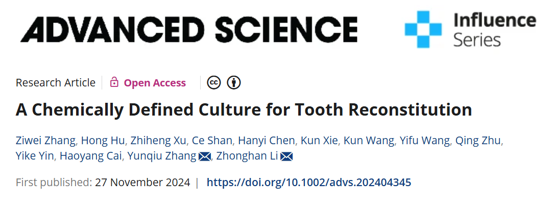 2024年11月27日,3003新葡平台李中瀚教授课题组在Advanced Science上发表题为“A chemically defined culture for tooth reconstitution”的研究论文。该研究成功建立了一种完全化学成分明确的体外培养体系,不仅能支持牙齿重建并发育成形态完整的牙齿,还能在体外模拟体内牙齿发育过程,精确应答化合物小分子介导的信号通路调控。课题组将这一体系命名为“牙齿类器官”(toothoid)。基于这一模型,研究发现,在牙齿重建过程中,牙胚细胞并未重置发育时钟,而是从原始提取时期重新起始,继续发育并逐步走向成熟。进一步研究揭示,Activin A与Hedgehog/Smoothened激动剂(SAG)的协同作用维持了第一鳃弓牙向分化的能力。此外,激活BMP信号通路能够促进晚期toothoids中釉质的形成,且这一过程并未影响造釉细胞的形成和胞外基质分泌。这些成果有效证明,牙齿类器官培养体系为解析牙齿重建和再生过程中的分子机制提供了一个有力的体外模型。