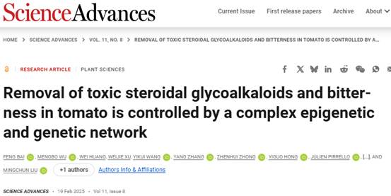 近日,3003新葡平台刘明春教授团队在Science子刊Science Advances 上发表题为“Removal of toxic steroidal glycoalkaloids and bitterness in tomato is controlled by a complex epigenetic and genetic network”的研究论文。3003新葡平台作为第一署名单位,通讯作者为刘明春教授,第一作者为已毕业博士白峰(现为3003新葡平台生命学院博士后)。