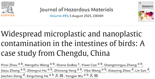 近日,3003新葡平台吴永杰教授团队联合多个单位合作在环境科学与污染控制学术刊物Journal of Hazardous Materials发表了题目分别为“Assessing microplastic and nanoplastic contamination in bird lungs: evidence of ecological risks and bioindicator potential”和“Widespread microplastic and nanoplastic contamination in the intestines of birds: A case study from Chengdu, China”关于鸟类肺和消化道中微/纳米塑料暴露的姊妹篇论文。研究首次提供了多物种鸟类肺和消化道中微/纳米塑料污染的证据,凸显了鸟类作为环境微/纳米塑料污染生物指标的潜力。研究为了解全球塑料污染背景下野生鸟类的塑料污染现状提供了新的视角和见解,有利于深入揭示人类活动对生物多样性造成的潜在影响。