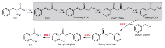 PALs将苯丙氨酸(Phe)转化为反式肉桂酸(t-CA),之后经过CNL、CHD和KAT参与的β-氧化途径(阴影标注)生成苯甲酰辅酶A(benzoyl-CoA)。BEBT催化苯甲酰辅酶A和苯甲醇(benzyl alcohol)发生酯化反应,生成苯甲酸苄酯(benzyl benzoate);苯甲酸苄酯经BBO催化发生羟基化,产生水杨酸苄酯(benzyl salicylate);最后, BSH裂解水杨酸苄酯,生成水杨酸(SA)。