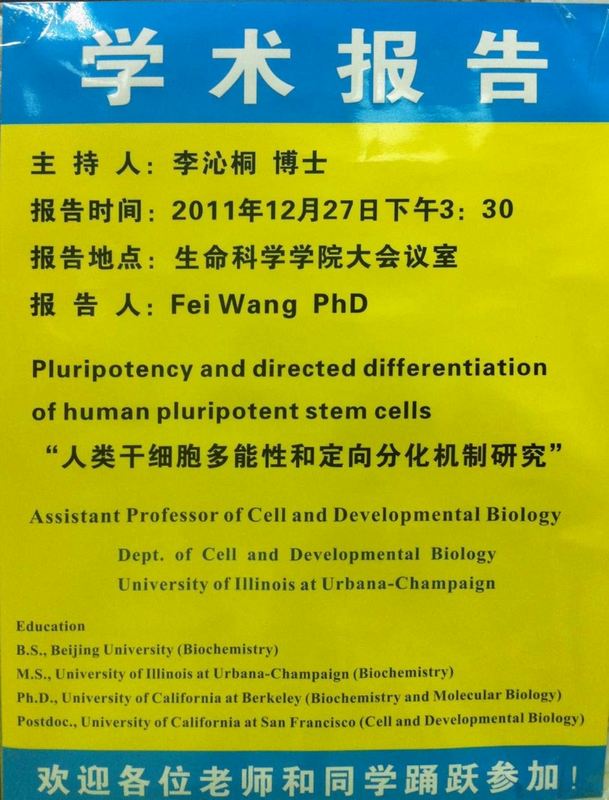 美国伊利诺伊大学Fei Wang PhD(主题:人类干细胞多能性和定向分化机制研究)2011.12.27学术报告