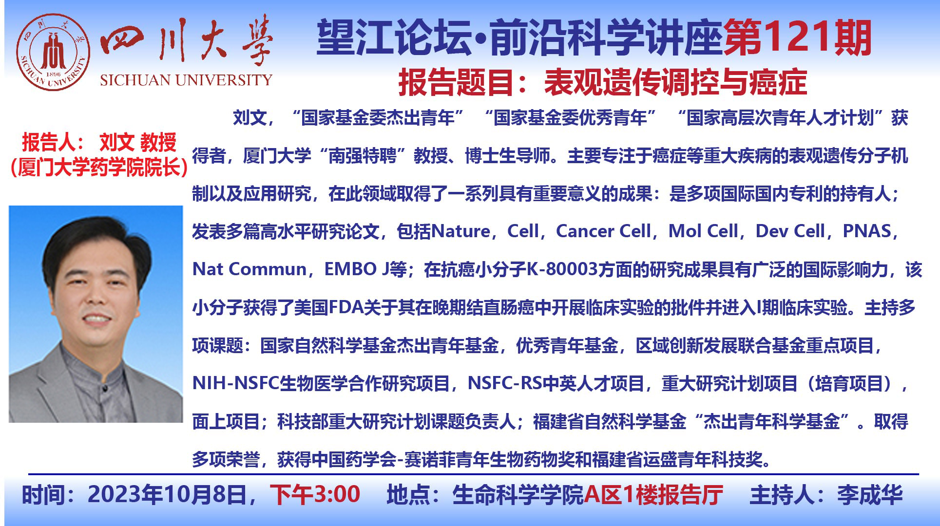 望江论坛-前沿科学讲座(第121期):刘文教授10月8日学术报告