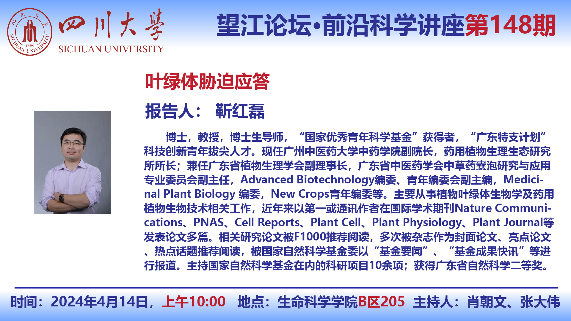 望江论坛-前沿科学讲座(第148期):靳红磊教授4月14日学术讲座
