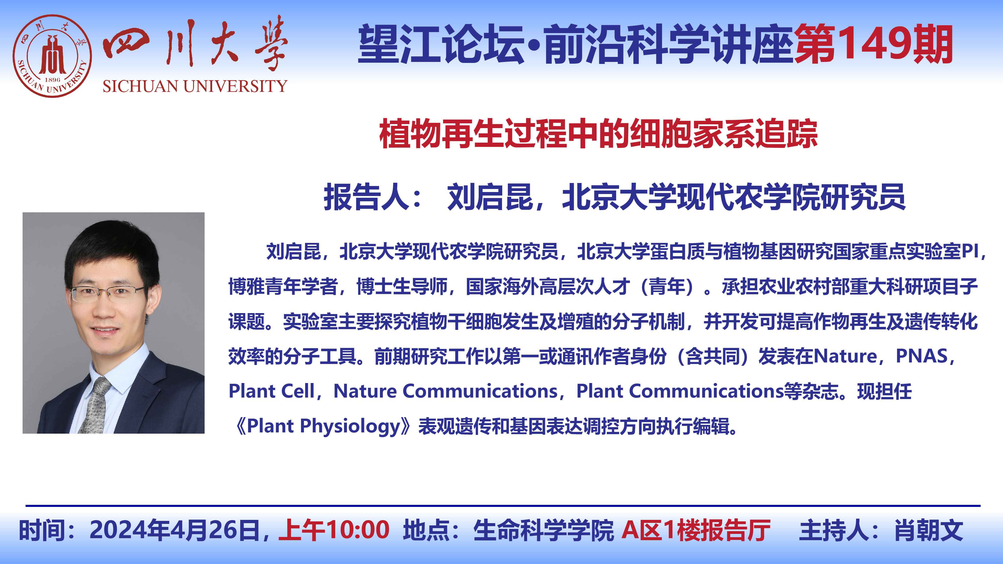 望江论坛-前沿科学讲座(第150期):黎家教授4月26日学术讲座